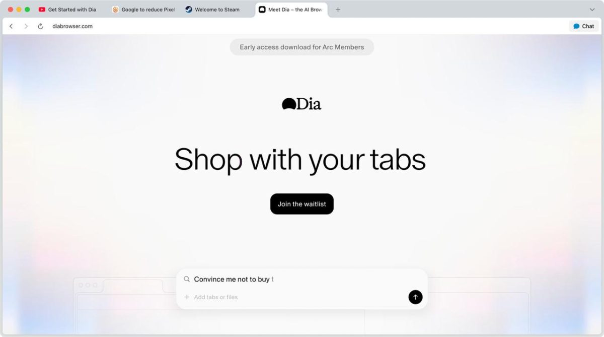 Dia is all-in on chat. Built by the makers of Arc, it puts an AI bar at the heart of your browsing. Ask questions about what you’re reading, reference multiple tabs, and get context-aware answers.